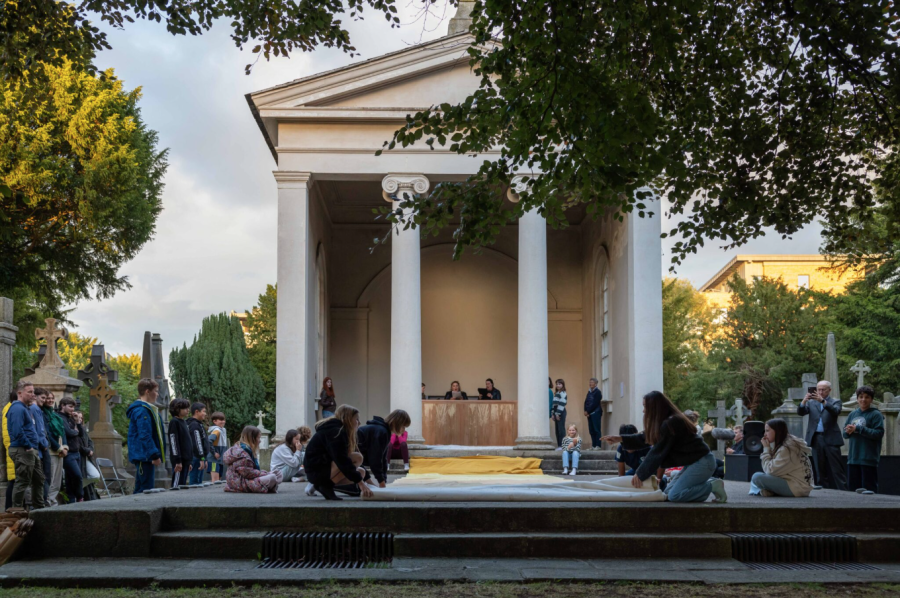 The installation sees a wooden box, representing both altar and casket, installed within the original mortuary chapel, a neoclassical Roman temple from 1835. For the events, the casket is opened and from it an 18-metre-long piece of fabric is unravelled to cover the platform in front of the chapel, extending down the steps and resting in front of a birch tree – rumoured to have been planted by O’Connell himself. The ecological wool is dyed an array of different colours using ingredients, such as ivy, weld, and rhubarb root, all of which grow onsite. Similarly, the wooden casket was made from yew and birch – native trees also found within the walls of the garden cemetery. The fabric provides a temporary space for visitors to sit and listen to the readings, also offering a visual and physical connection between the architecture and its surrounding environment. The birch tree has grown, like the city around Goldenbridge, and its canopy stretches ever closer to the mortuary chapel.