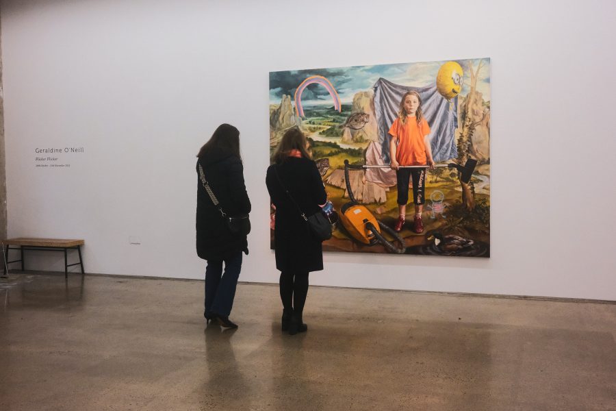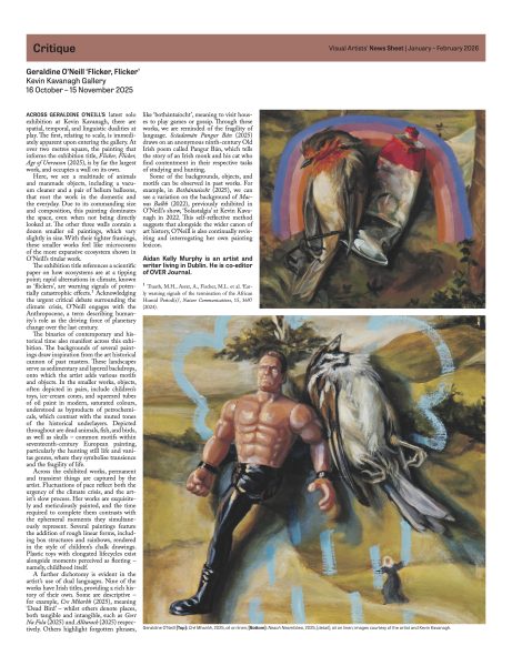 Across Geraldine O’Neill’s latest solo exhibition at Kevin Kavanagh, there are spatial, temporal, and linguistic dualities at play. The first, relating to scale, is immediately apparent upon entering the gallery. At over two metres square, the painting that informs the exhibition title, Flicker, Flicker, Age of Unreason (2025), is by far the largest work, and occupies a wall on its own.